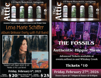 All events begin at 8pm. Advanced ticketing information for other upcoming Attic shows is available at www.theatticmontana.com. The Attic is located at 110 N Main in Livingston, just above Whiskey Creek Saloon. •