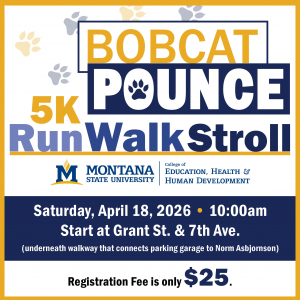 The 5th annual Bobcat Pounce: 5K Run, Walk Stroll will be held on campus starting at 10am Saturday, April 18th. The race’s starting and ending point and check-in tables will be at MSU underneath the walkway that connects the parking garage to Norm Asbjornson Hall.