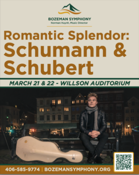 The Bozeman Symphony invites audiences to revel in sweeping melodies and heartfelt expression at Romantic Splendor: Schumann & Schubert, featuring acclaimed cellist Jonathan Swensen. Performances will be held Saturday, March 21st, at 7:30pm, and Sunday, March 22nd, at 2:30pm. Both will be held at the Willson Auditorium in Downtown Bozeman.