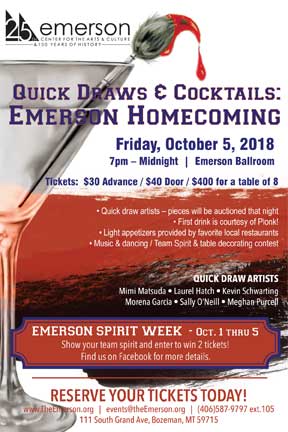 Rally for arts & culture in the Gallatin Valley with the EmersonGrab your pompoms, throw on your team jersey and join the Emerson Center for the Arts & Culture on Friday, October 5th for Quick Draws & Cocktails: Emerson Homecoming. The Emerson is celebrating the 25 years of teamwork in making arts and culture accessible to the Gallatin Valley.