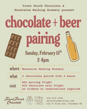 « All Events MW Chocolate & Beer Pairing February 15 @ 2:00pm « 406 WinterFest “The Aprés” The Music of Hans Zimmer and Ennio Morricone » + Google Calendar+ Add to iCalendar Details Date: February 15 Time: 2:00pm - 8:00pm Event Category: Miscellanea Venue Mountains Walking Brewery 422 Plum Ave Bozeman, MT United States + Google Map Phone: (406) 219-3480 Website: https://www.mountainswalking.com/