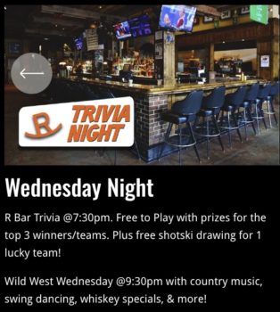 « All Events This event has passed. R Bar Trivia April 22 @ 7:30pm « Studio Recital: Piano Student of Er-Hsuan Li & Kenneth Christensen Molly Trivia » + Google Calendar+ Add to iCalendar Details Date: April 22 Time: 7:30pm Event Category: Miscellanea Venue Rocking R Bar 211 E Main Bozeman, United States + Google Map Phone: 587-9355 Website: https://rockingrbar.com/