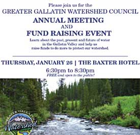 The Greater Gallatin Watershed Council (GGWC) will host its Annual Meeting & Fundraising Event on Thursday, January 26th at the Baxter Hotel Grand Ballroom beginning at 6:30pm.