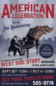 An American Celebration with special guest pianist Jon Nakamatsu An American Celebration with special guest pianist Jon Nakamatsu As an American Orchestra entering its 50th year, the Bozeman Symphony begins a season of celebrations with fitting tributes to the music of our native land. Bernstein’s Candide Overture begins the performance and next, the much-anticipated return of one of Bozeman Symphony’s most requested guest artists: Van Cliburn Gold Medalist Jon Nakamatsu, performing Gershwin’s flashy Piano Concerto in F. A deeply introspective moment follows with Samuel Barber’s Essay No. 1, and the finale of Symphonic Dances from one of our greatest American masterpieces, West Side Story. Star Spangled Indeed! Welcoming his return, Jon Nakamatsu first performed with the Bozeman Symphony in February 2003.