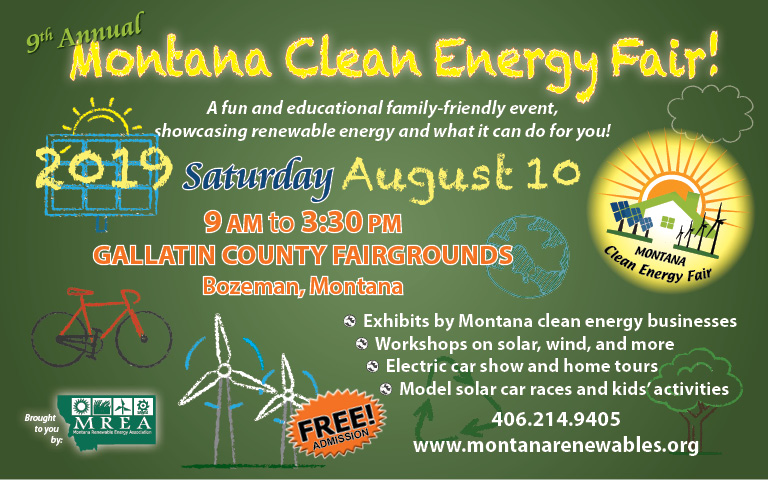 The Montana Renewable Energy Association has announced the Montana Clean Energy Fair for Saturday, August 10th from 9am to 3:30pm at the Gallatin County Fairgrounds. This is the ninth year the event has traveled around the state to different cities and the second time it’s come to Bozeman. The Fair brings hundreds of Montanans from around the region to participate.
