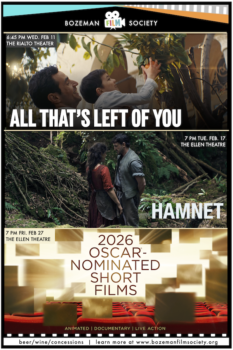 All That’s Left of You screens Feb. 11th at the Rialto, before moving back to the Ellen for its screenings on Feb. 17th with Hamnet and the Oscar Shorts on Feb. 27th. Wine, beer and concessions will be available prior to the screenings. Find ticketing access and learn more about the current season at www.bozemanfilmsociety.org – and Keep ‘Em Flickering! •