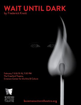 For the next production in its eleventh season, Bozeman Actors Theatre presents Frederick Knott’s Wait Until Dark. Performances will be held February 7th and 8th, as well as Feb. 13th to 16th at the Emerson Center for the Arts & Culture. Show time is 7:30pm each night.