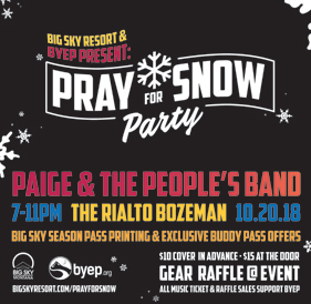 Help generate good karma for another unforgettable ski season by attending Big Sky Resort’s “Pray for Snow” party in benefit of Big Sky Youth Empowerment (BYEP). The event heads down the canyon on Saturday, October 20th, setting up at the Rialto in Downtown Bozeman from 7–11pm.