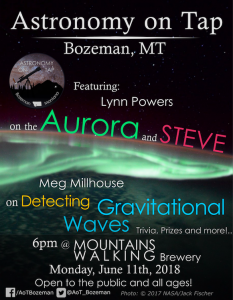 Bozeman’s next Astronomy on Tap returns to Mountains Walking Brewery on Monday, June 11th for its first summer event with “Spotting the Aurora, Steve & Detecting Gravitational Waves” on topic from 6–8pm. Lynn Powers, an Aurorasaurus Ambassador, will present. Meg Millhouse will also be talking ...