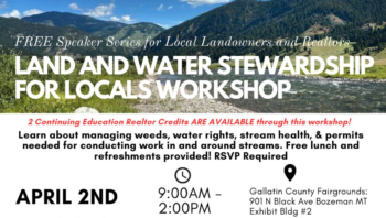 Gallatin Conservation District closes its “Land & Water Stewardship for Locals” series with its final gathering this month. A Daylong Stewardship Workshop, will take place Thursday, April 2nd, at the Gallatin County Fairgrounds. The event will be held from 9am–2pm.
