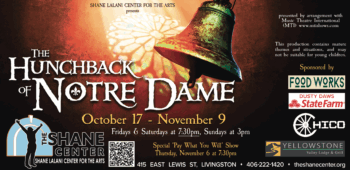 The Hunchback of Notre Dame runs weekends from Oct. 17th to Nov. 9th. Performances take place in the Dulcie Theatre. Show times are Fridays and Saturdays at 7:30pm, with Sunday matinees to follow at 3pm. A special Thursday show is set for Nov. 6th at 7:30pm. Tickets are $25 for adults, $19 for seniors/students/veterans, and $13 for youth 17 & under. Make reservations at www.theshanecenter.org or call the box office at (406) 222-1420. This production contains mature themes and situations, and may not be suitable for young children. Concessions available.