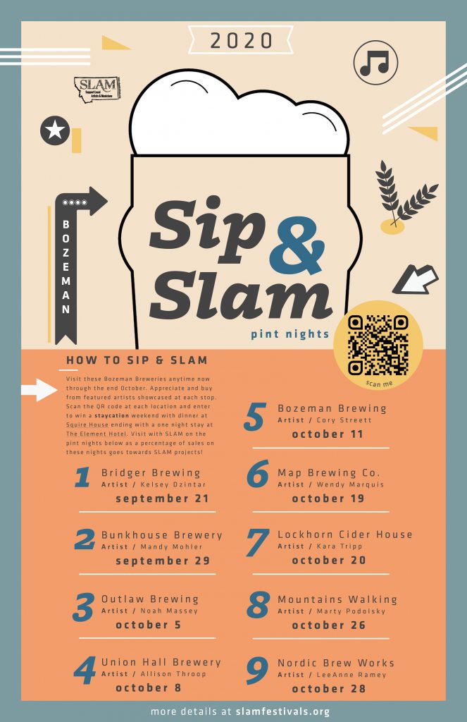 Additionally, each Sip & SLAM venue will be generously hosting a special Give Pint Night when a portion of proceeds will directly benefit SLAM. This is a great way to sample the fantastic libations made right here in Bozeman, appreciate and buy art from local Montana talent, and support SLAM at the same time! All the artwork on display at the breweries will be available for purchase from the artist, with a percentage going back to support SLAM.