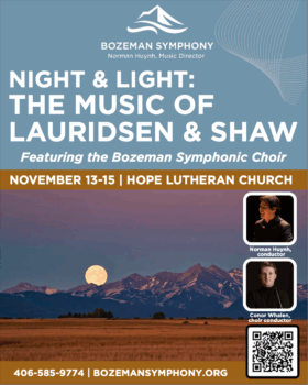 The Bozeman Symphonic Choir and Bozeman Symphony present “Night & Light: The Music of Lauridsen & Shaw,” a moving program of three choral masterpieces by celebrated composers Morten Lauridsen and Caroline Shaw. Performances will be held November 13th–15th. Thursday and Friday shows begin at 7:30pm, followed by a closing performance on Saturday at 2:30pm. All will be held at Hope Lutheran Church on the edge of Bozeman.