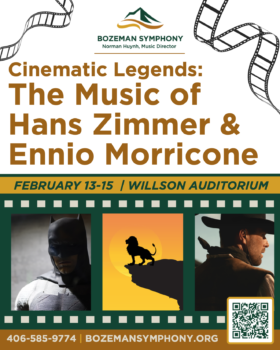 Prepare for a thrilling journey through some of the most unforgettable moments in film history as the Bozeman Symphony presents Cinematic Legends: The Music of Hans Zimmer & Ennio Morricone over Valentine’s weekend. Performances will be held Friday and Saturday, February 13th–14th, at 7:30pm, and Sunday, February 15th, at 2:30pm. All will be held at the Willson Auditorium in Downtown Bozeman.