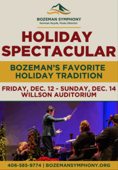 To meet the popular demand for this annual tradition, the Bozeman Symphony will offer four Holiday Spectacular performances to experience the joy of the season. Performances will be held Dec. 12th–14th at the Willson Auditorium in Downtown Bozeman. Individual tickets are available for purchase online at www.bozemansymphony.org or by phone at (406) 585-9774. Tickets at the door based on availability. Tickets begin at $30 with student-discounted tickets available.